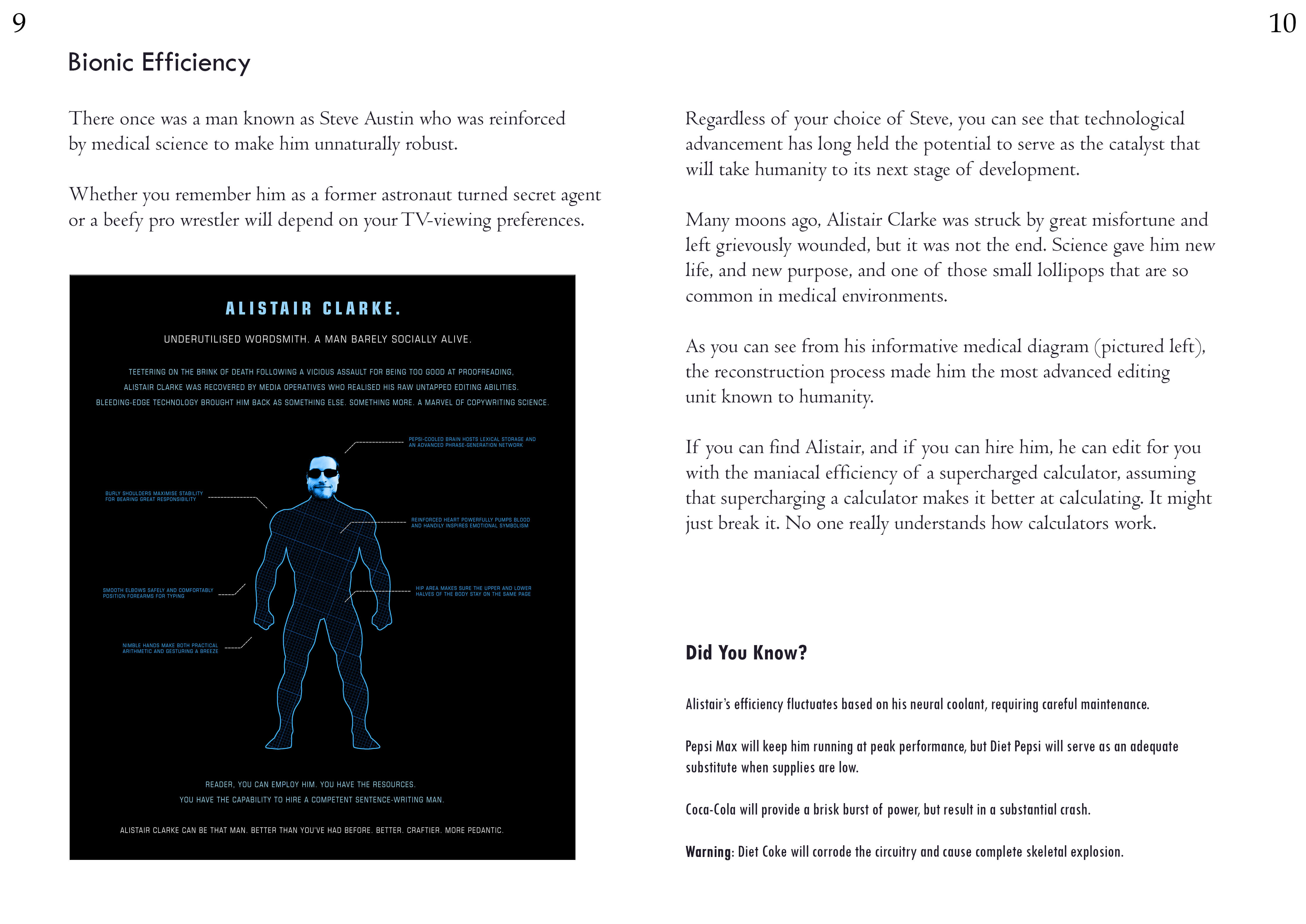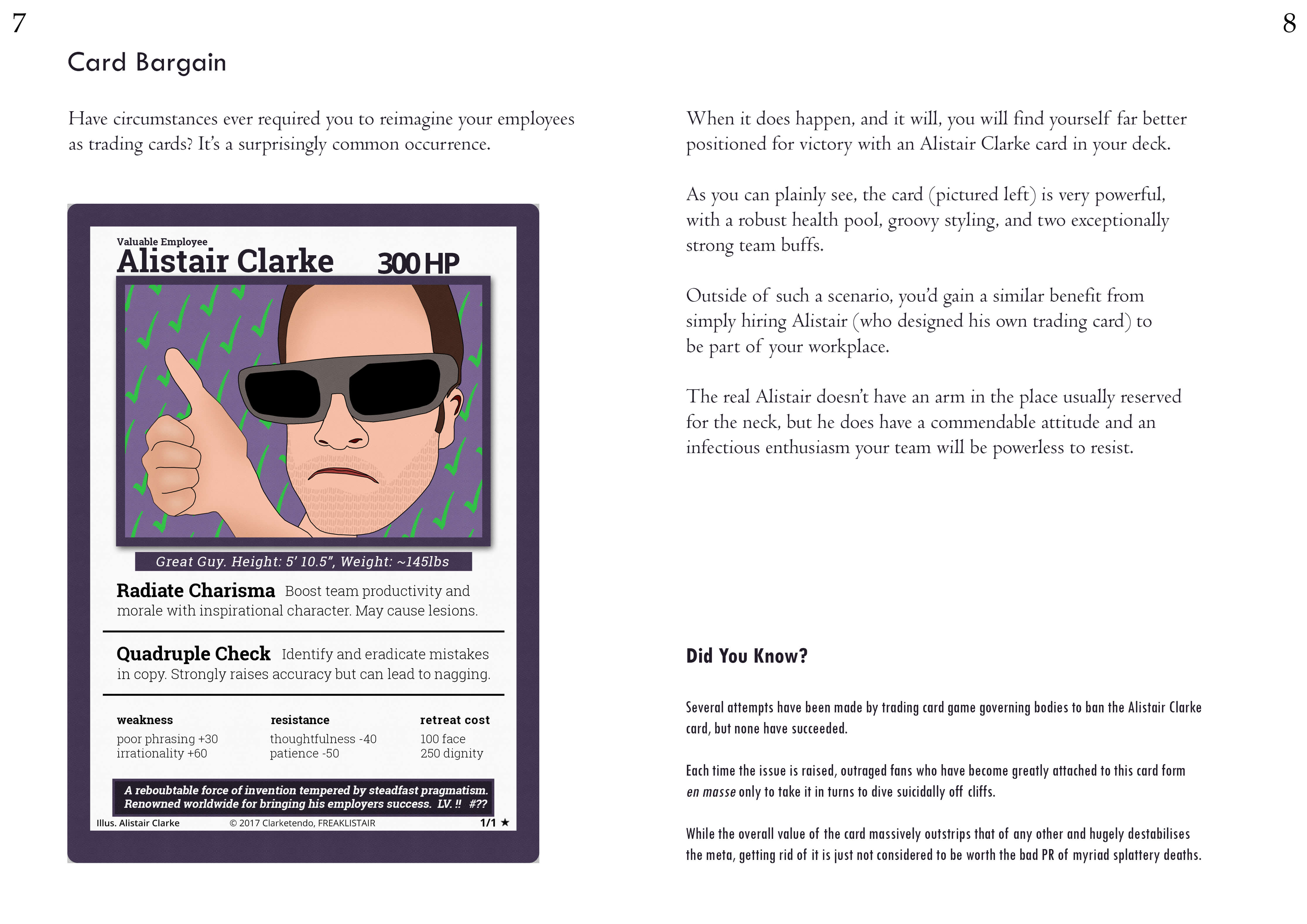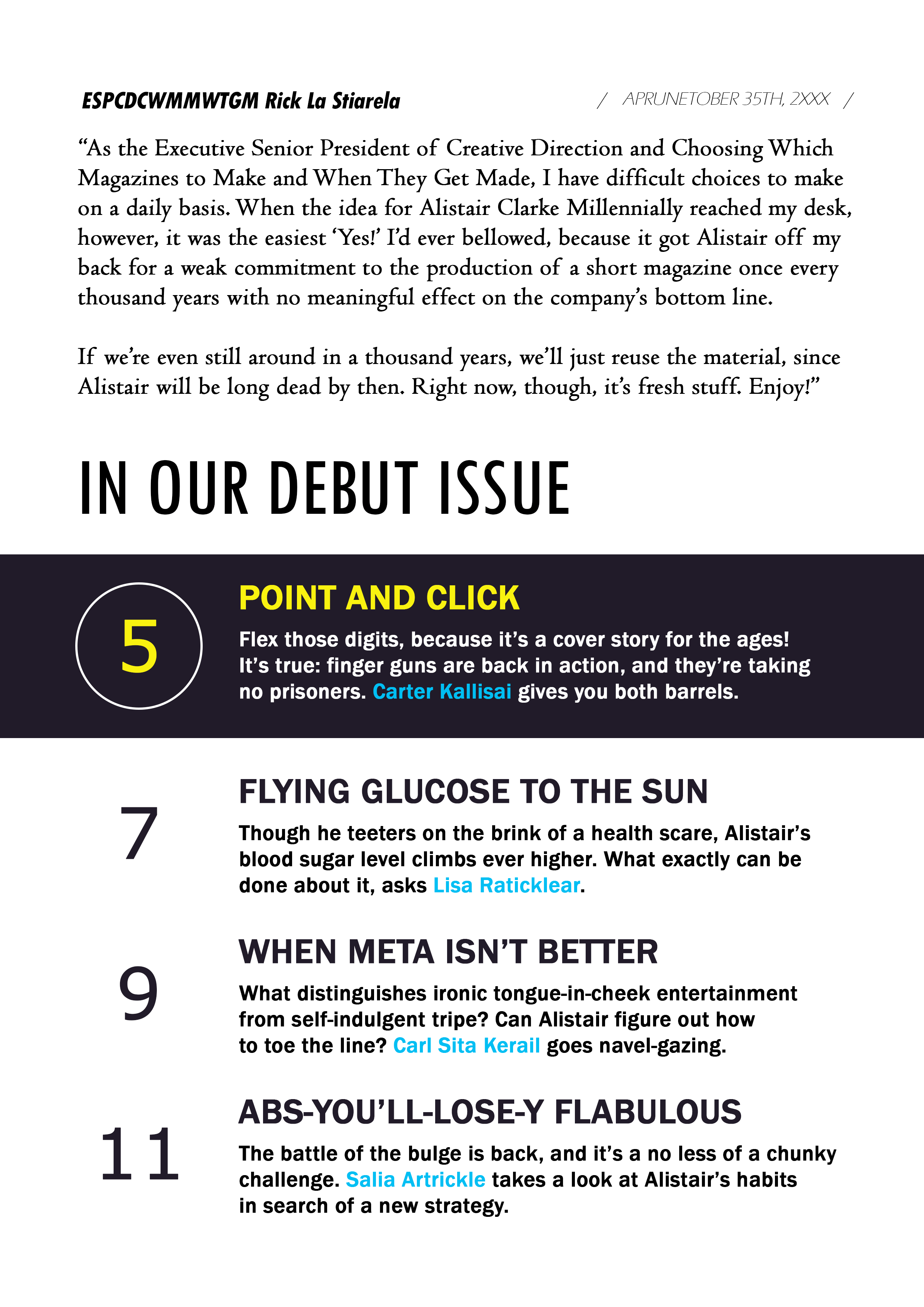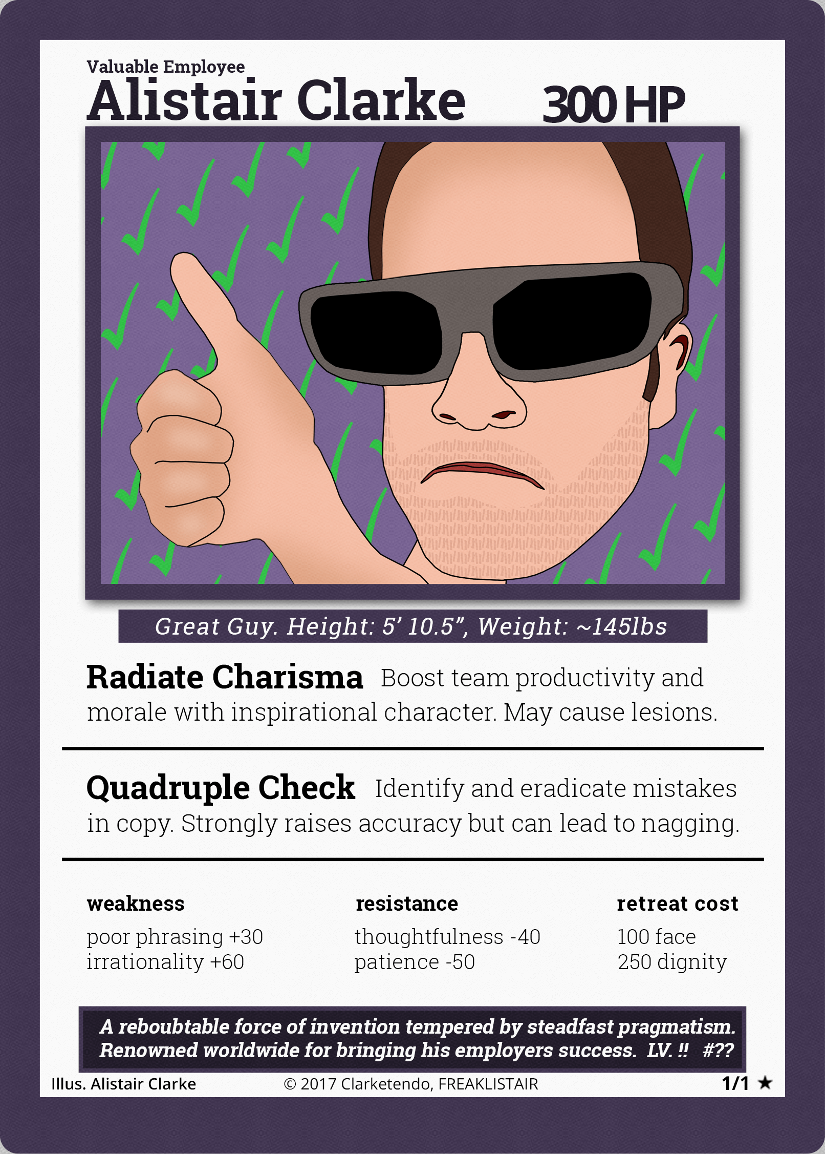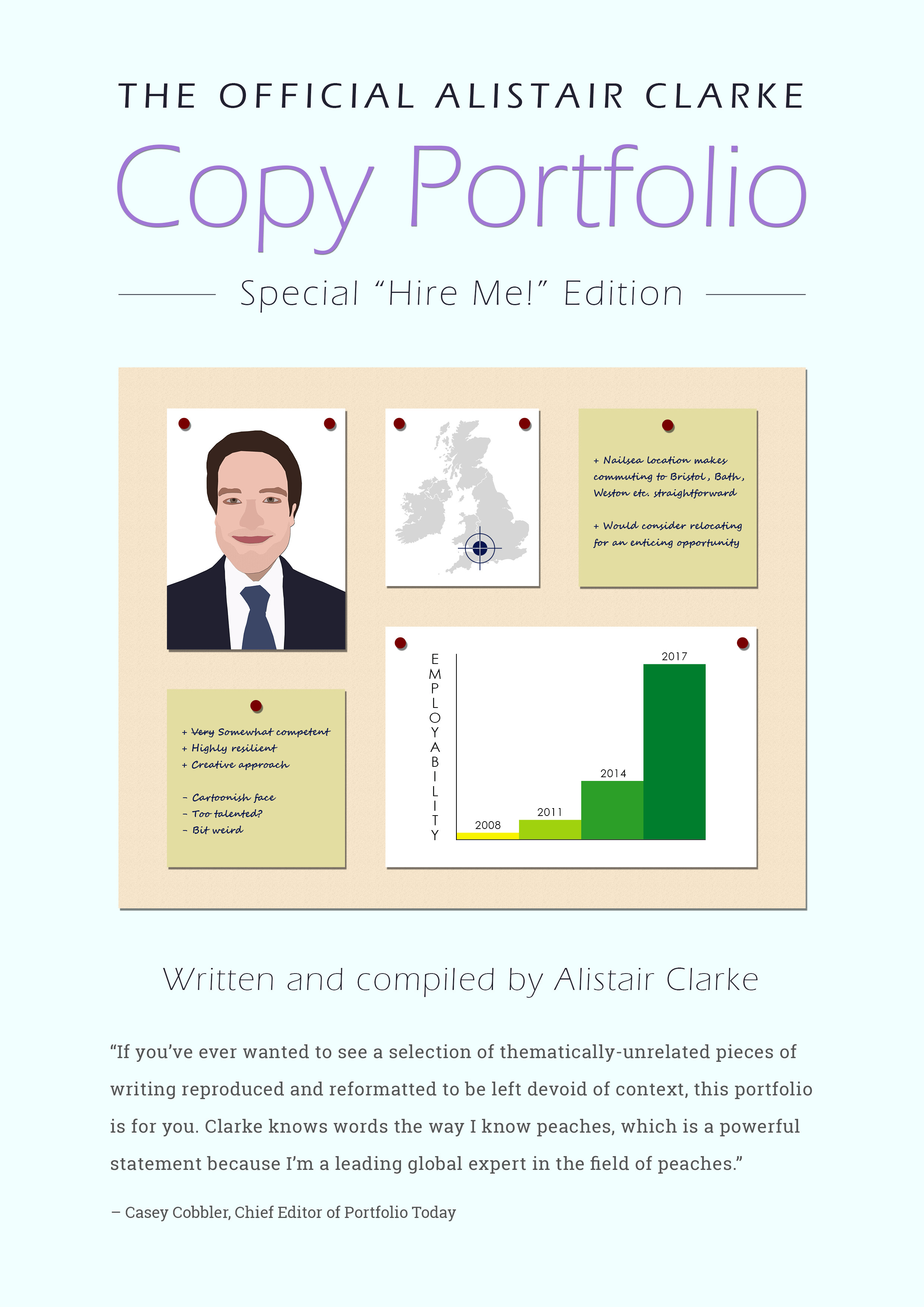 Anonymity as a writer has kept me from producing a conventional portfolio, but it couldn't keep me from churning out this hodgepodge. The following collection of satire and self-reference does prove I can write, though. And create graphics. And design documents. And make poor choices.