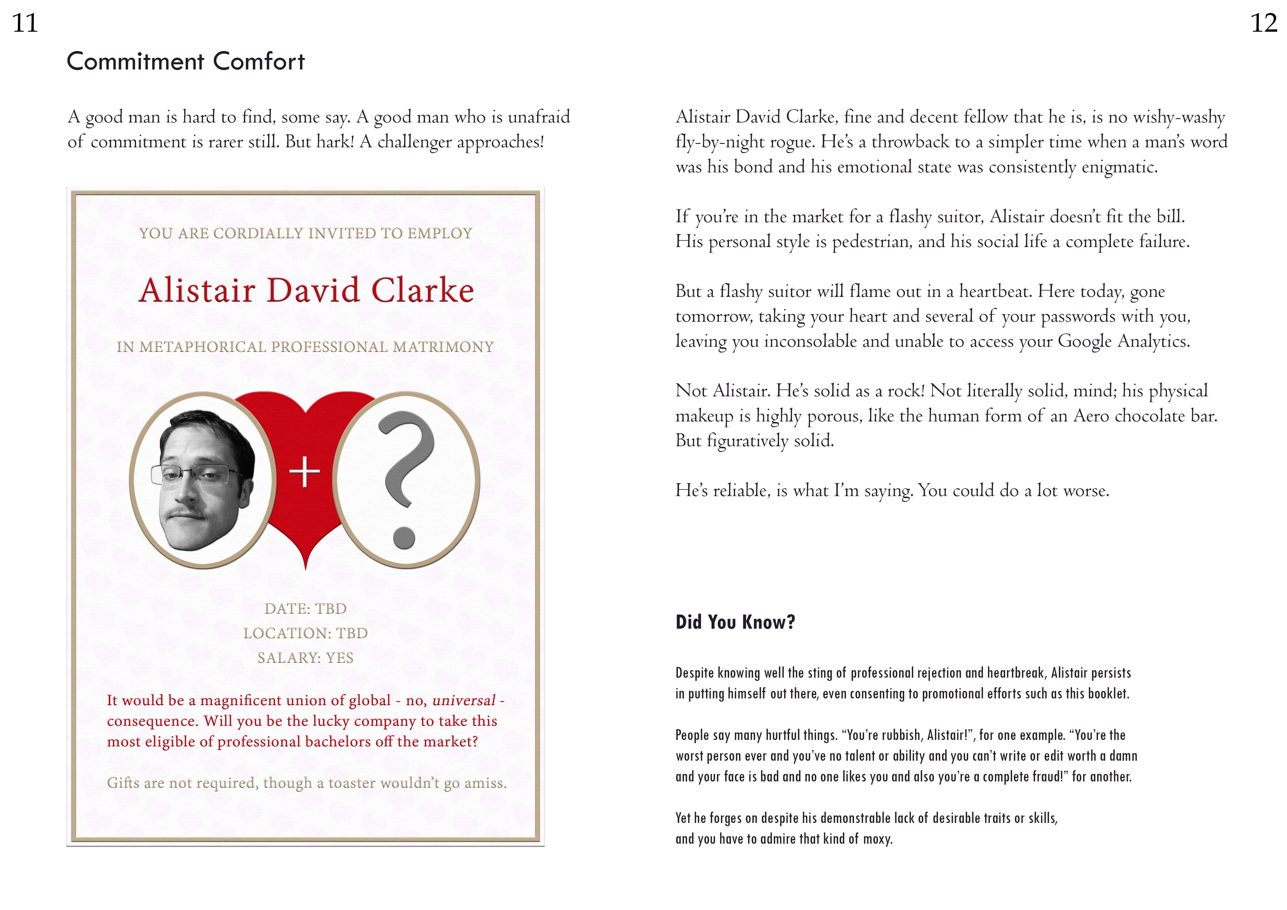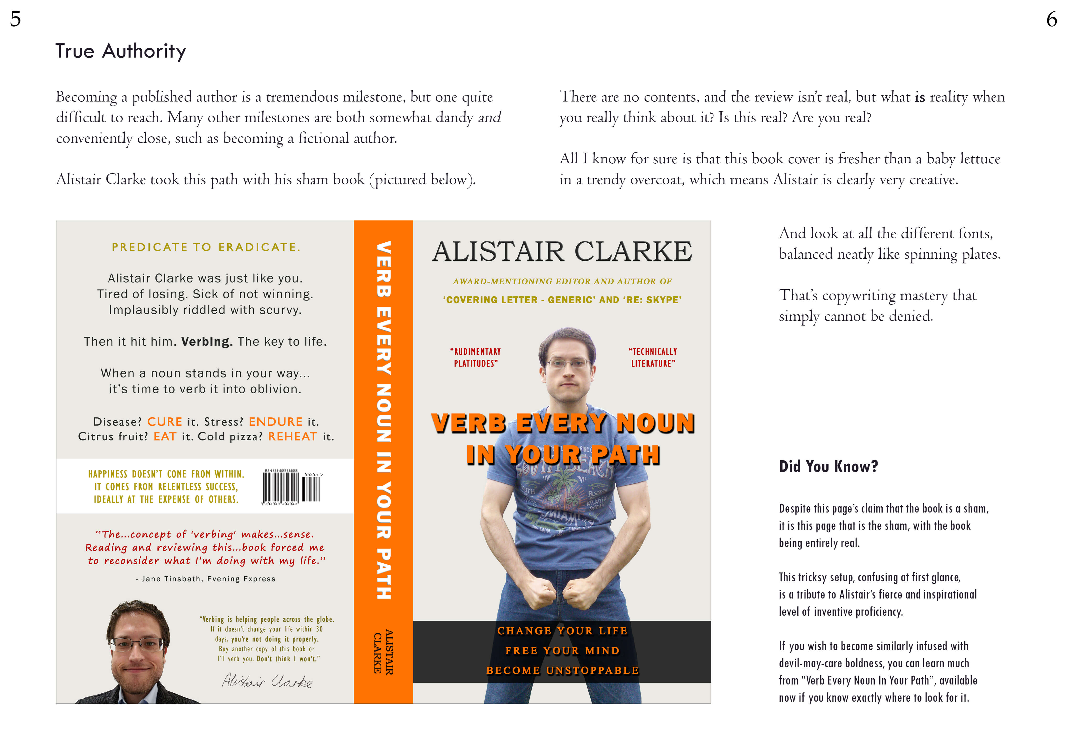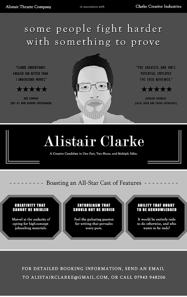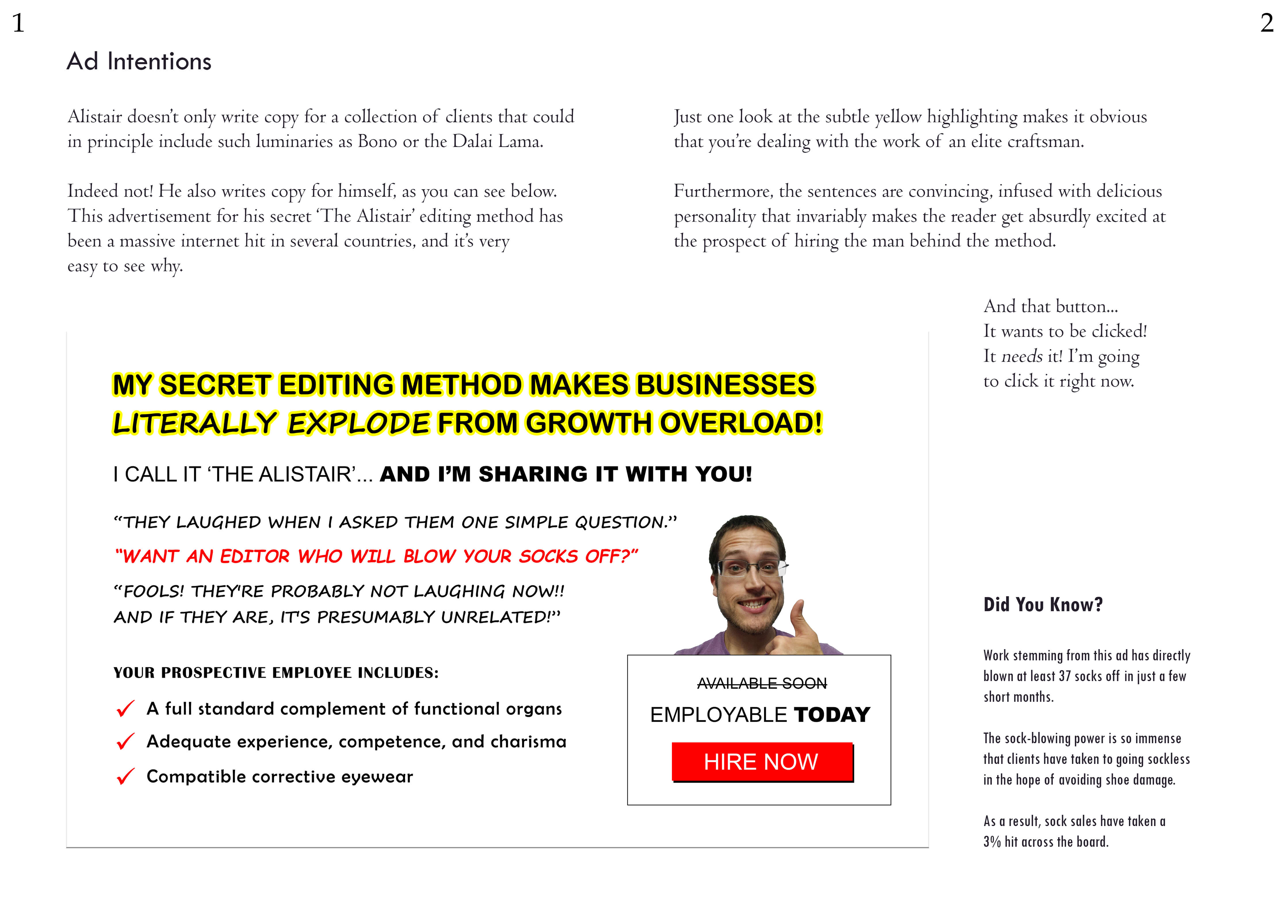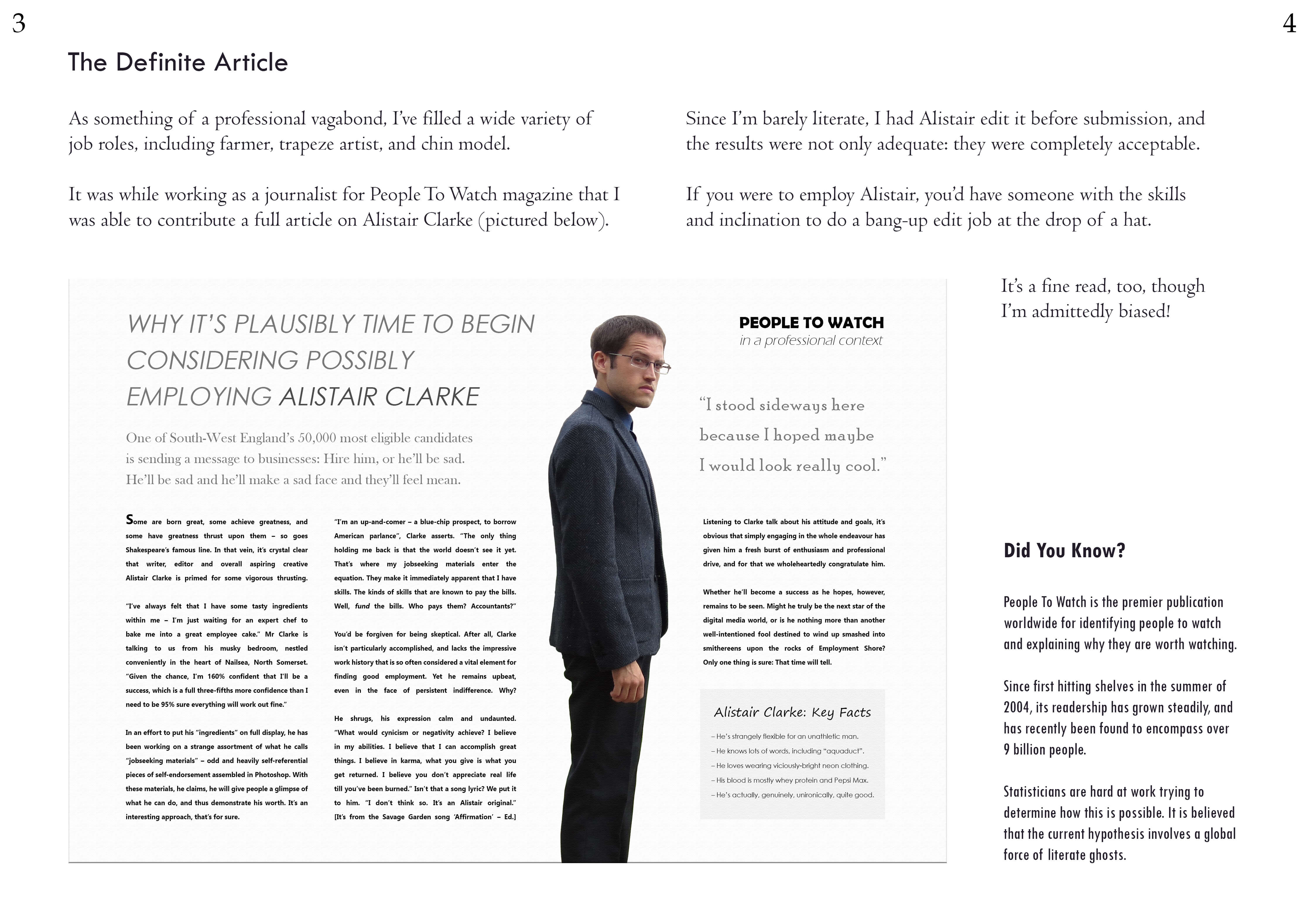 Anonymity as a writer has kept me from producing a conventional portfolio, but it couldn't keep me from churning out this hodgepodge. The following collection of satire and self-reference does prove I can write, though. And create graphics. And design documents. And make poor choices.