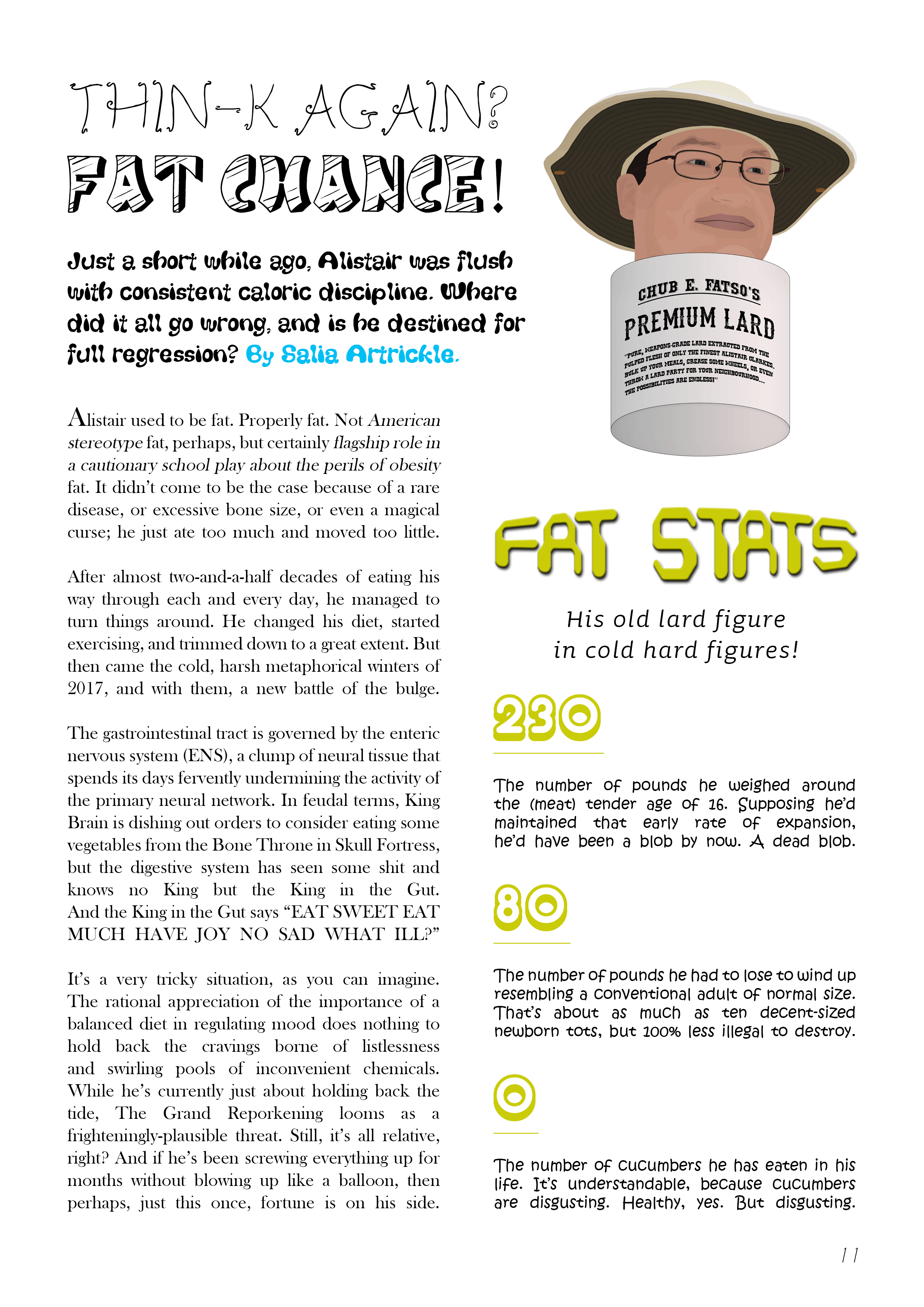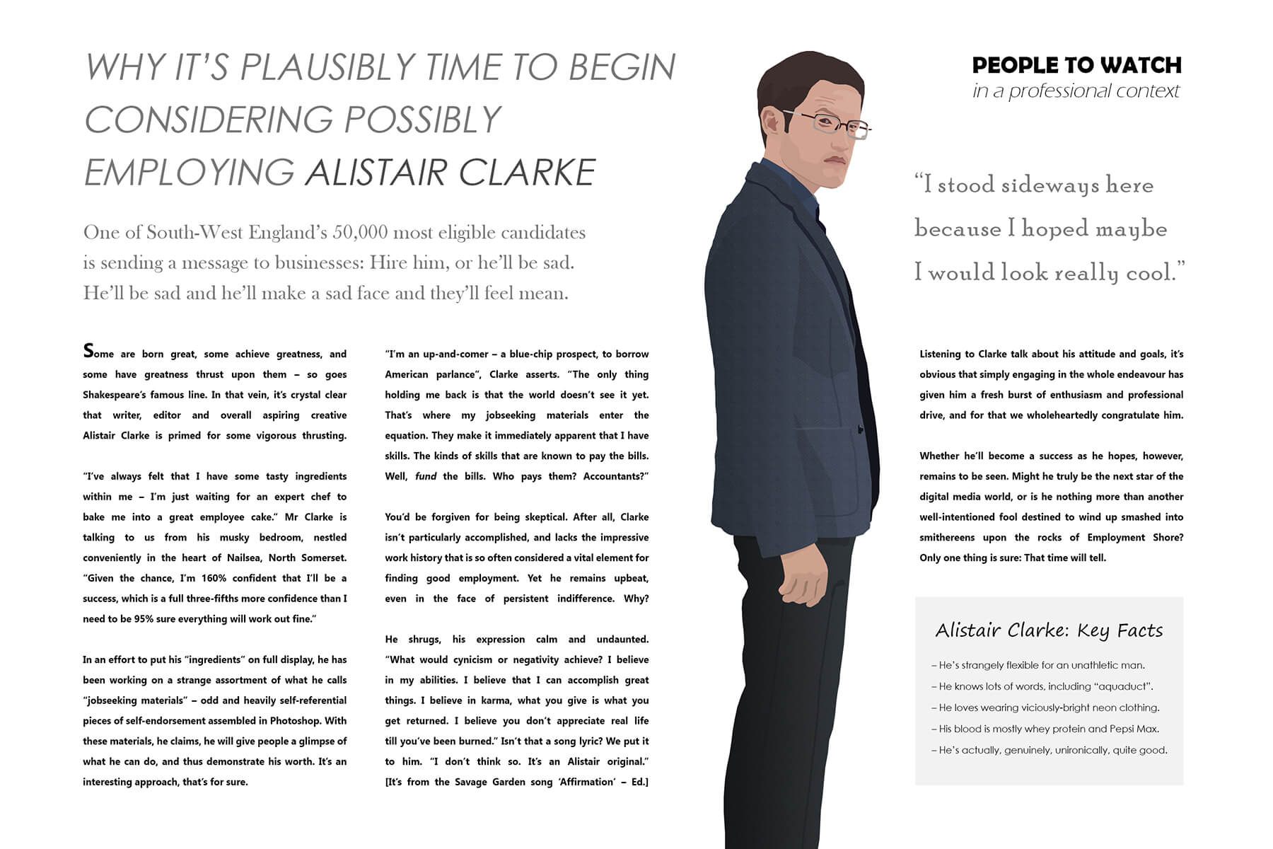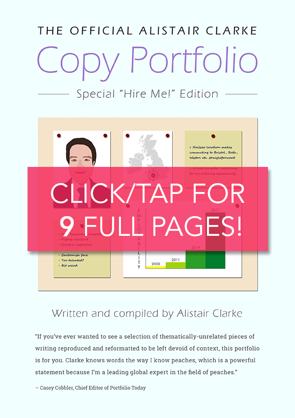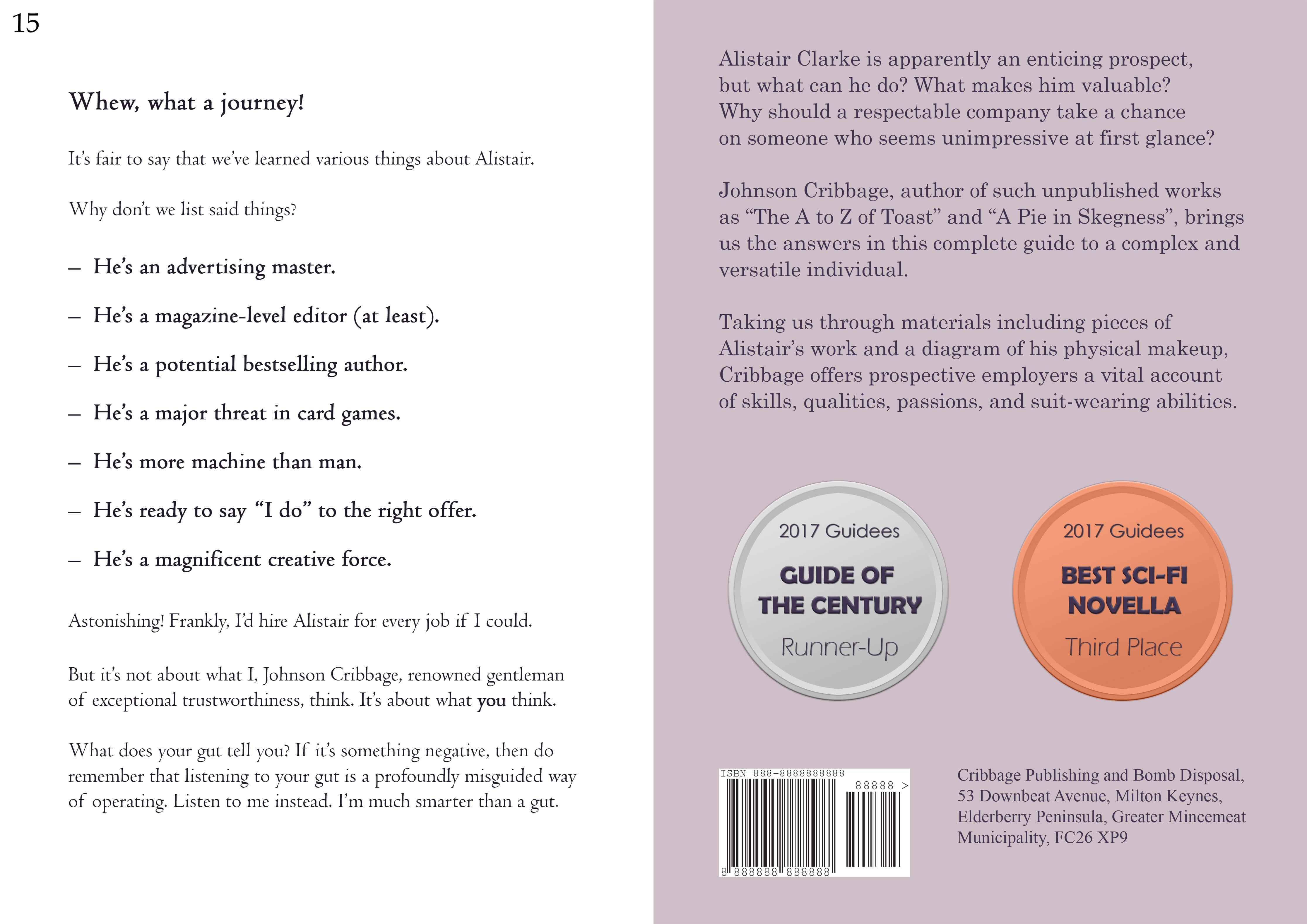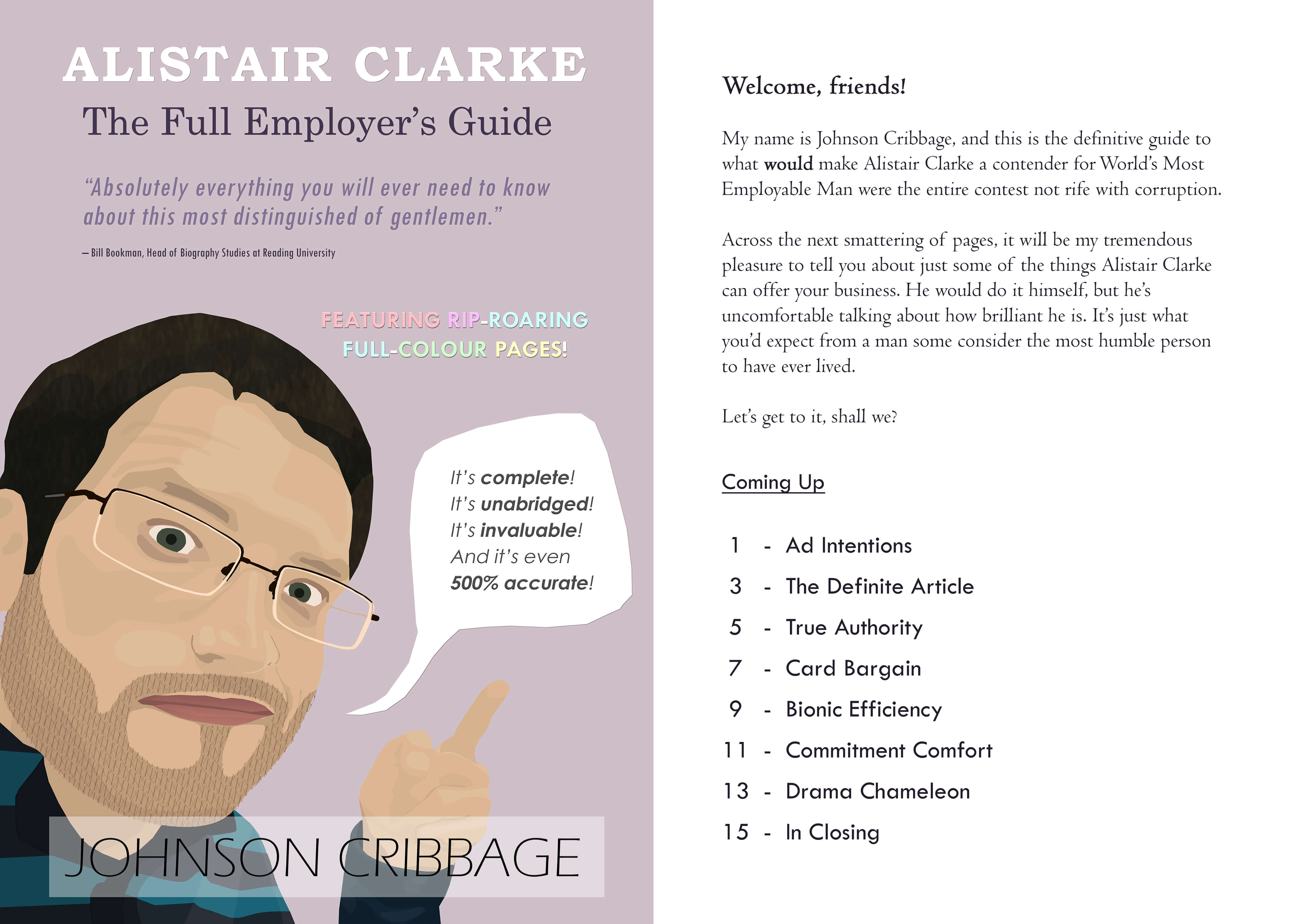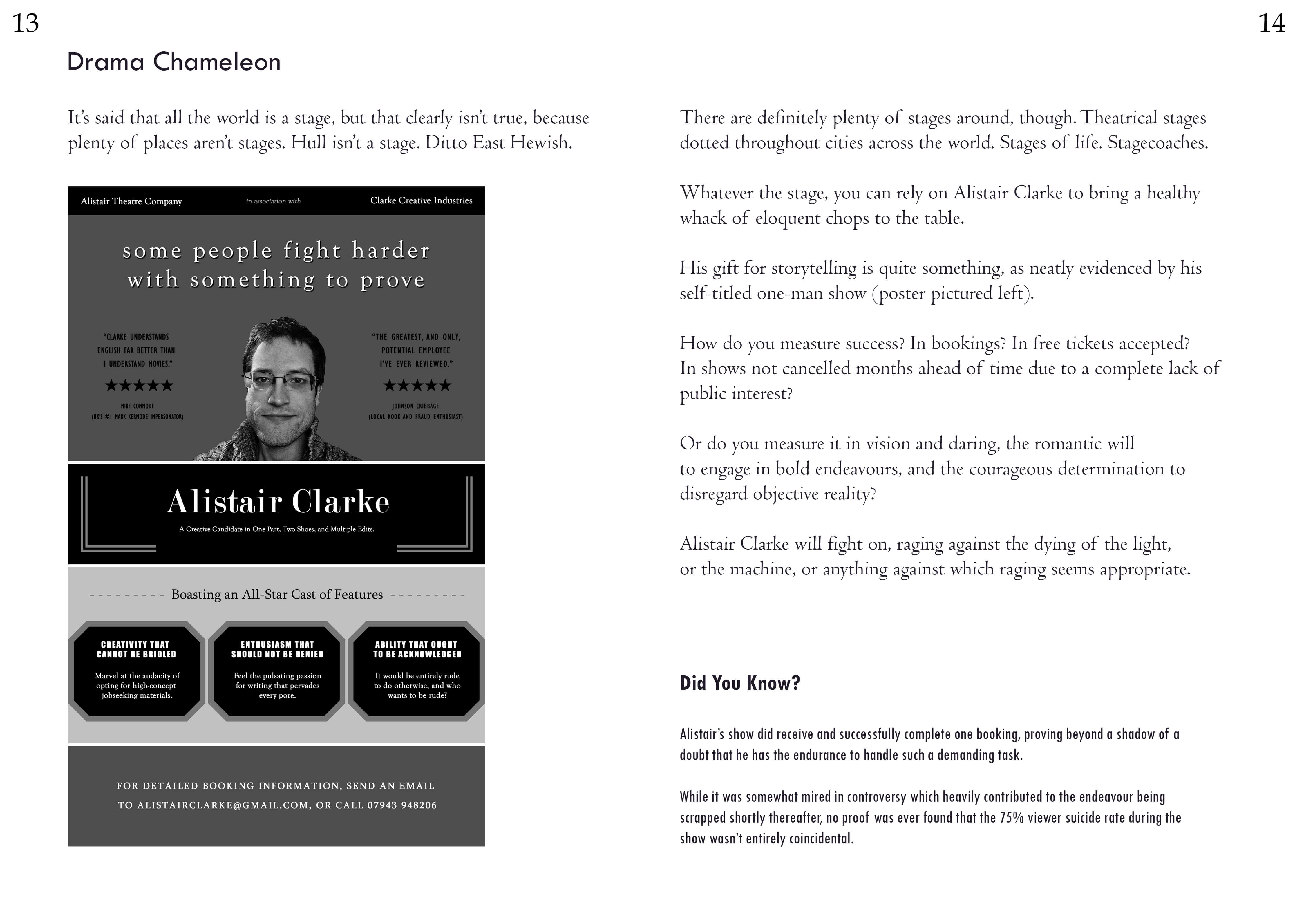 Anonymity as a writer has kept me from producing a conventional portfolio, but it couldn't keep me from churning out this hodgepodge. The following collection of satire and self-reference does prove I can write, though. And create graphics. And design documents. And make poor choices.